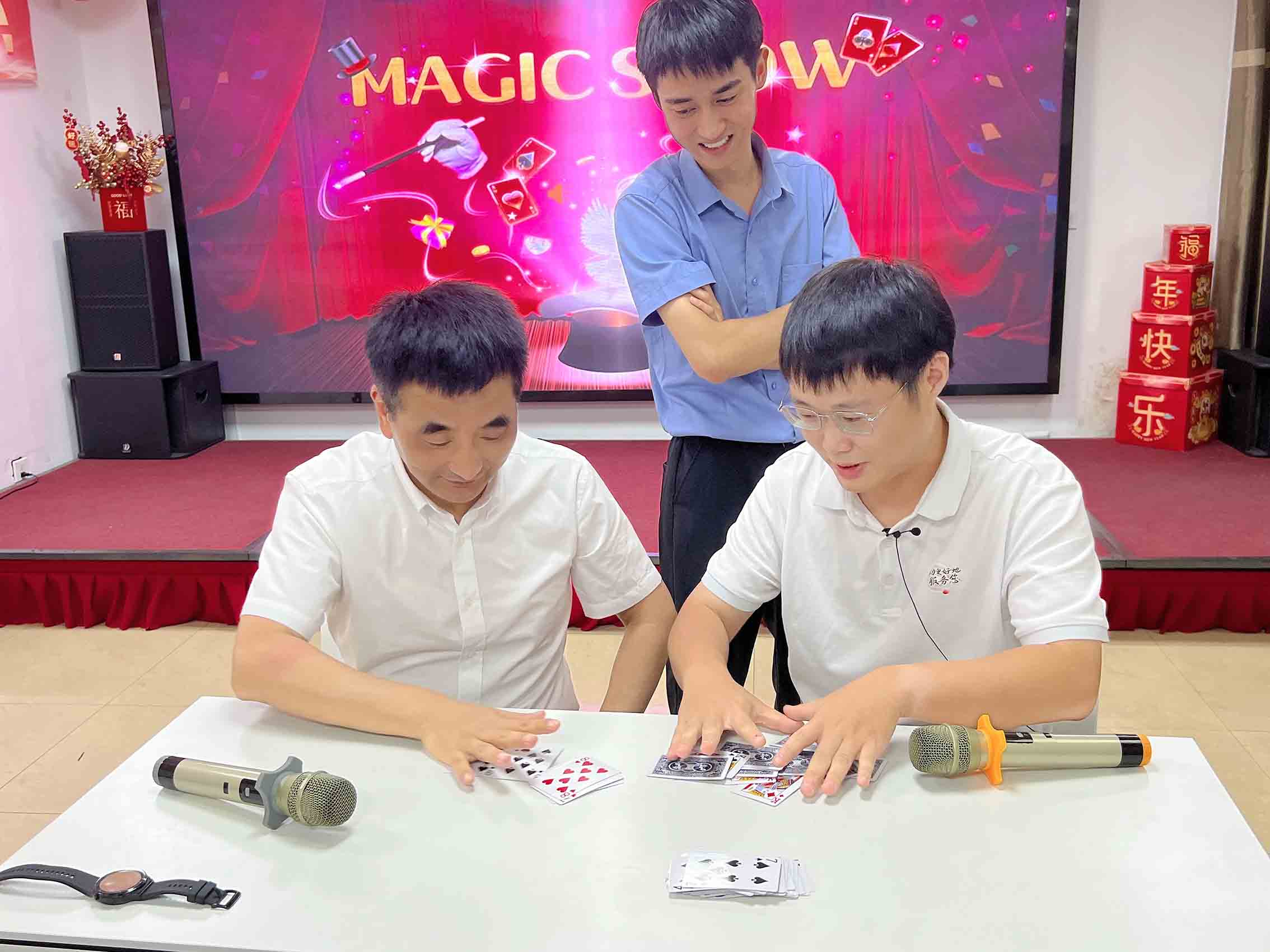 緊接著,售后部的同事化身為魔術(shù)師,手持一副普通的撲克牌,卻仿佛擁有了讀心術(shù)一般。在觀眾的注視下,他特意邀請(qǐng)了我們總經(jīng)理上臺(tái)參與互動(dòng)。魔術(shù)師先讓總經(jīng)理隨機(jī)選取一張牌并牢記,隨后將牌放回牌堆中洗牌。令人驚奇的是,無(wú)論牌堆如何被打亂,魔術(shù)師總能猜出牌面。